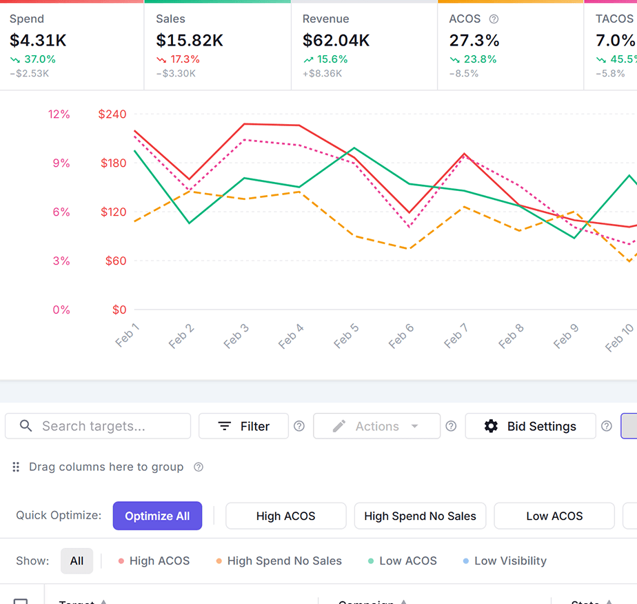 Connect your Amazon accounts, set your targets, and watch performance improve.